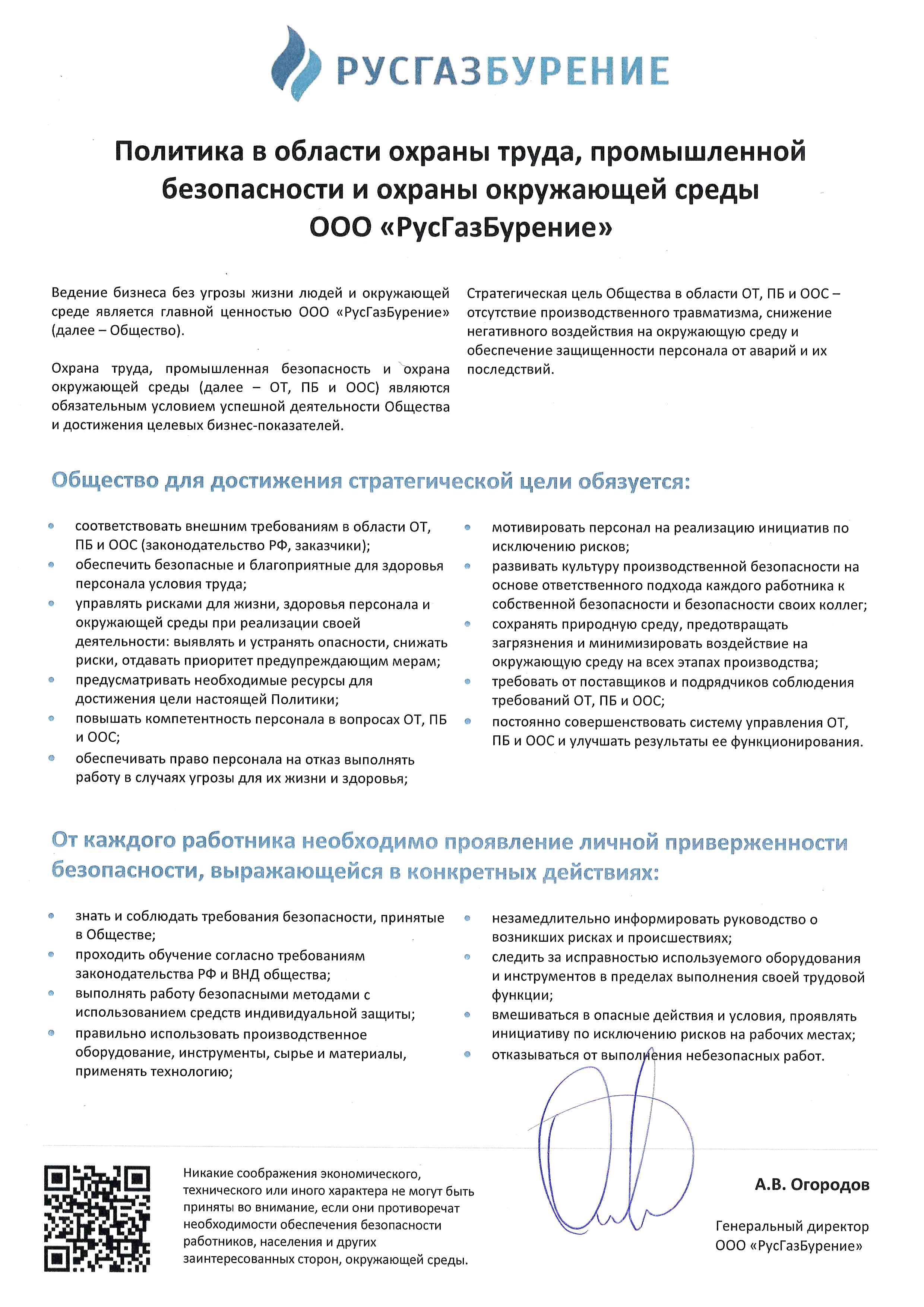 Основные цели ООО «РусГазБурение» в области производственной и экологической безопасности