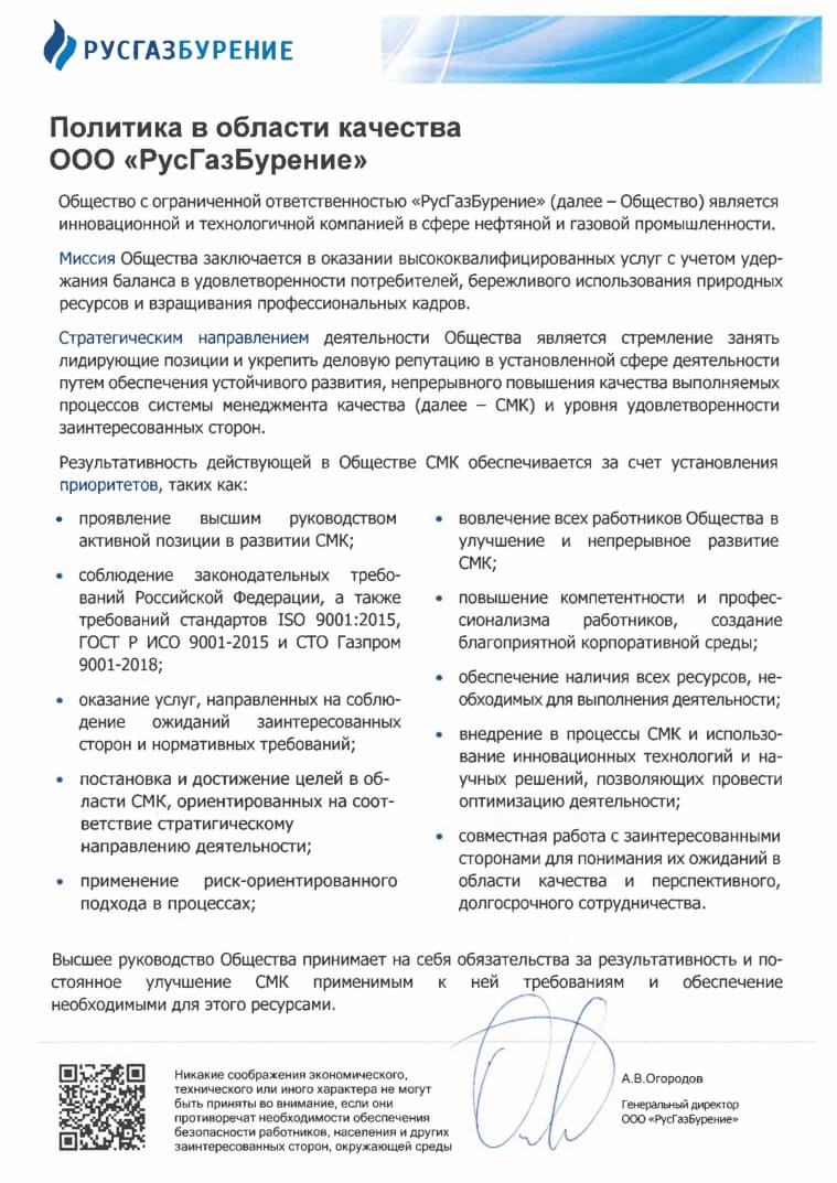Получение сертификатов соответствия требованиям стандартов в области качества является показателем открытости ООО «РусГазБурение» к новым вызовам современного мира.